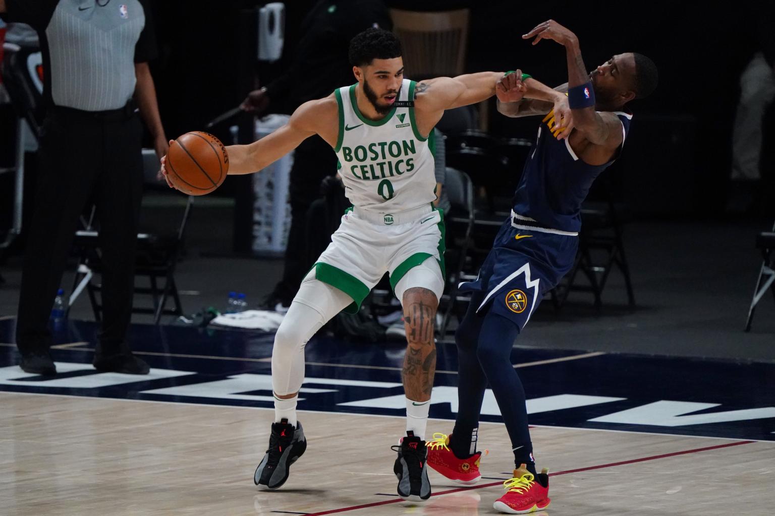 Jayson Tatum (in white) of the Boston Celtics during a game against the Denver Nuggets in Colorado on April 11, 2021.