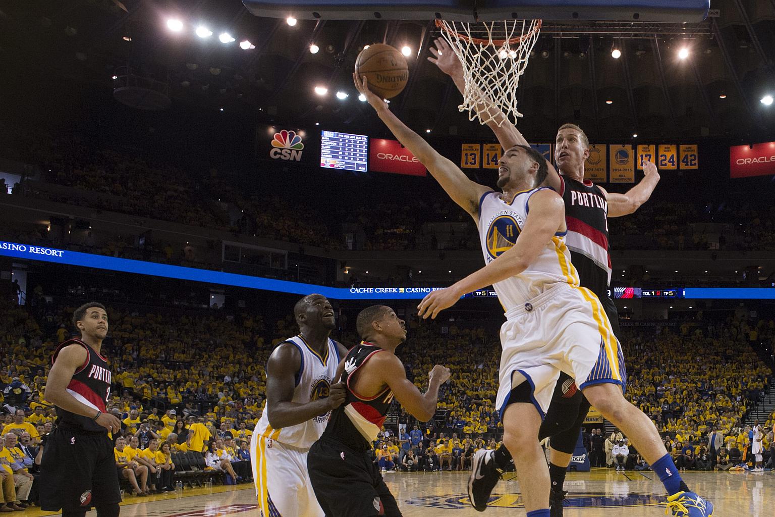 Golden State Warriors guard Klay Thompson (second from right) goes to the basket as Portland Trail Blazers center Mason Plumlee (right) defends.