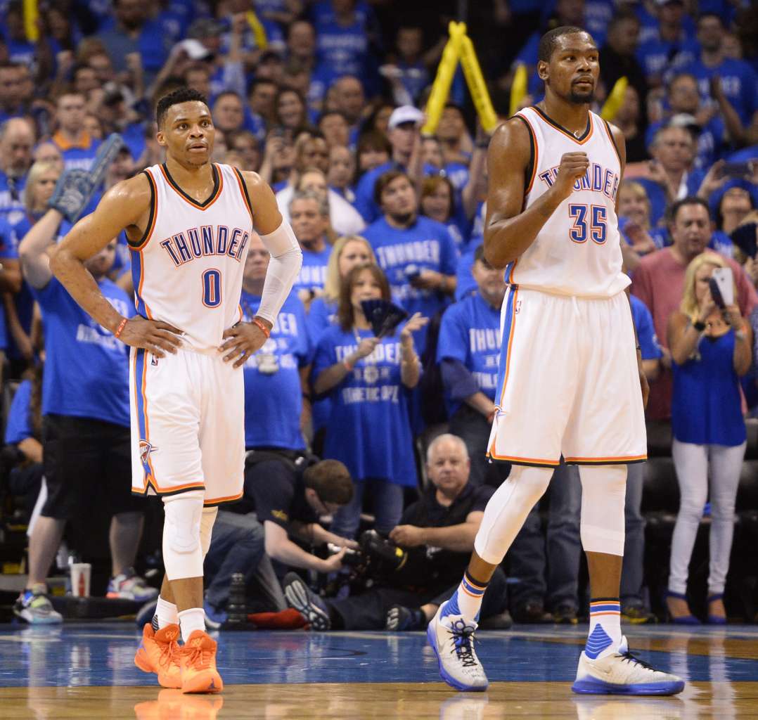 Oklahoma City Thunder's players Kevin Durant (right) and Russell Westbrook during the NBA Western Conference game on May 12, 2016.