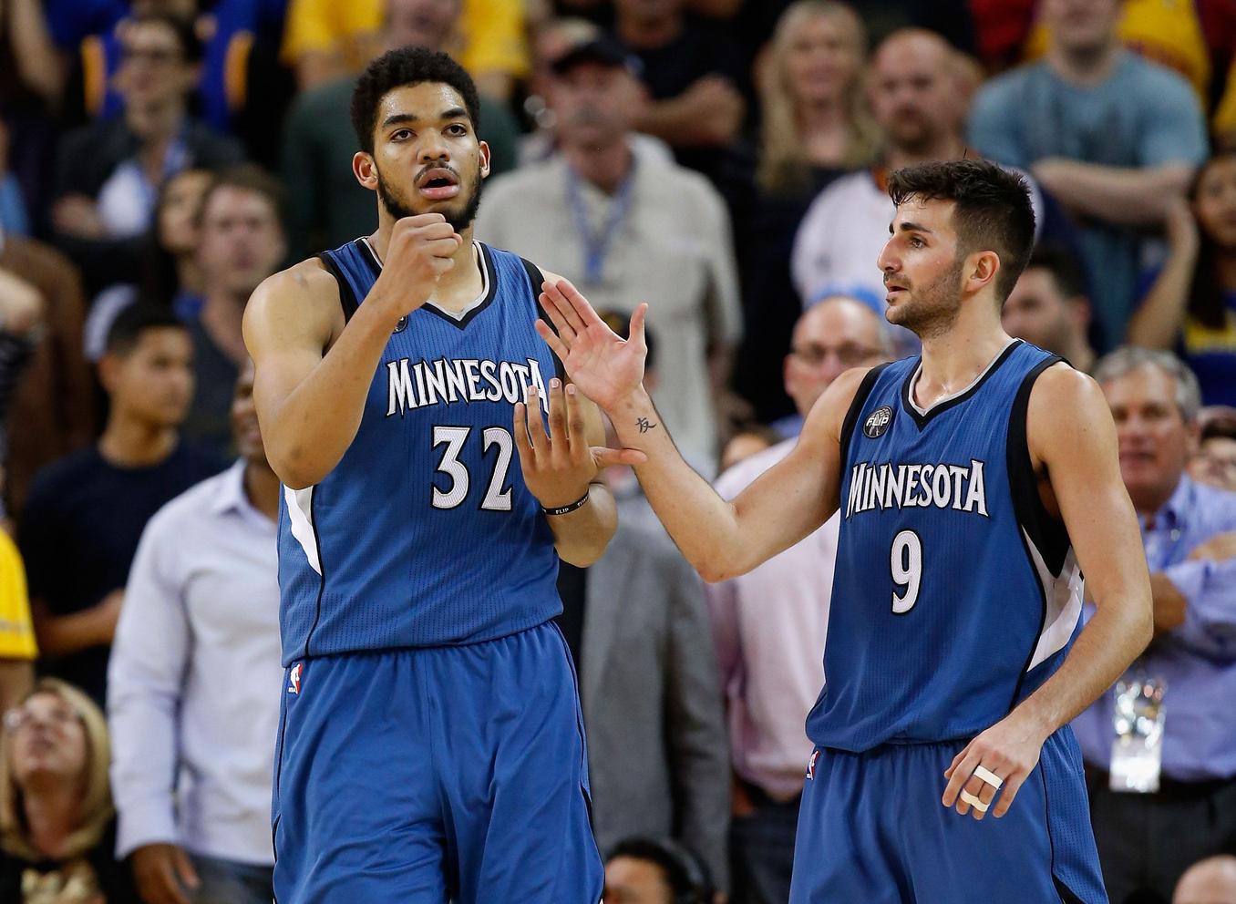 Karl-Anthony Towns (left) of the Minnesota Timberwolves is congratulated by Ricky Rubio after he made a basket against the Golden State Warriors on April 5, 2016.