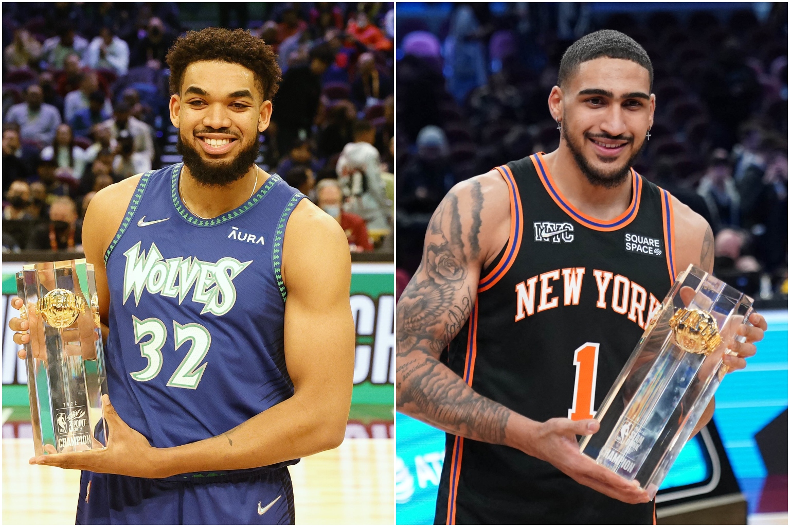 Karl-Anthony Towns (left) scored a record 29 points in the three-point contest while Obi Toppin soared to victory in the slam dunk contest.