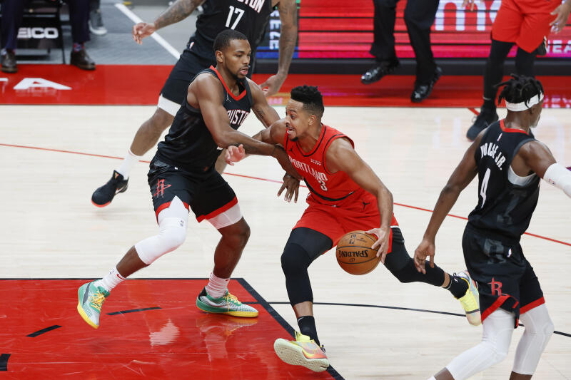 Portland Trail Blazers guard CJ McCollum driving to the basket against Houston Rockets guard Sterling Brown during the match on Dec 26, 2020.