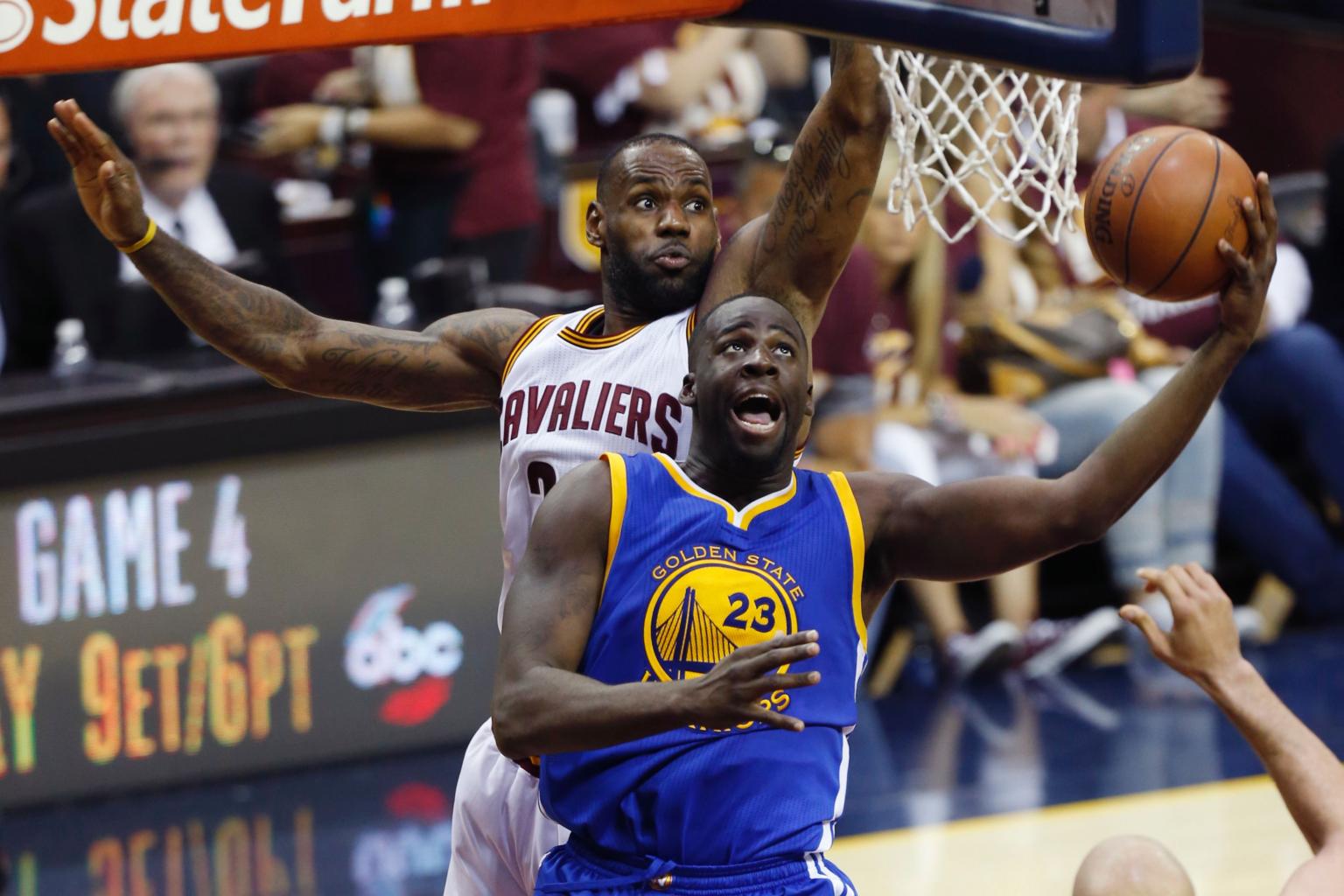 Golden State Warriors forward Draymond Green (right) shoots the ball in front of Cleveland Cavaliers forward LeBron James during Game 3 of the NBA Finals.