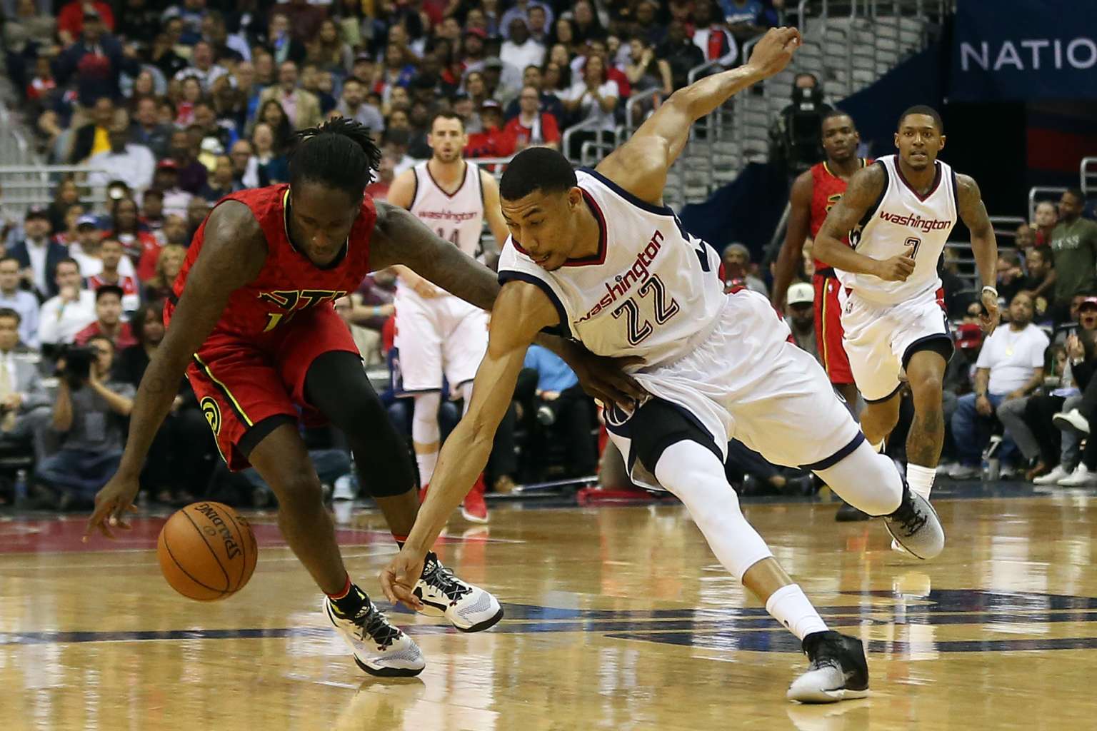 Atlanta Hawks forward Taurean Prince and Washington Wizards forward Otto Porter Jr. battle for a loose ball in the third quarter in game five of the first round of the 2017 NBA Playoffs at Verizon Center, on April 26, 2017.