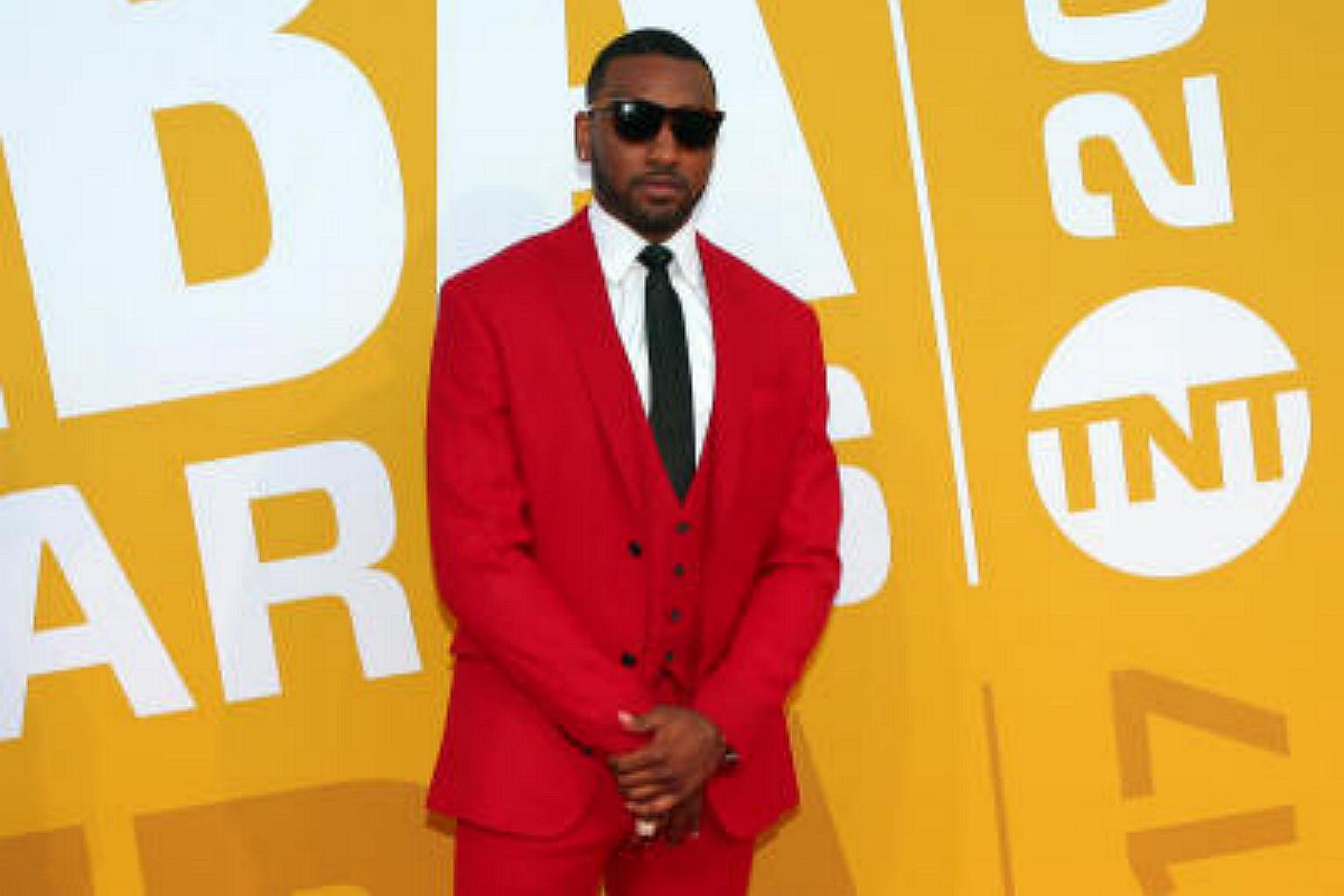 NBA player John Wall poses for photos on the red carpet before the 2017 NBA Awards at Basketball City at Pier 36.