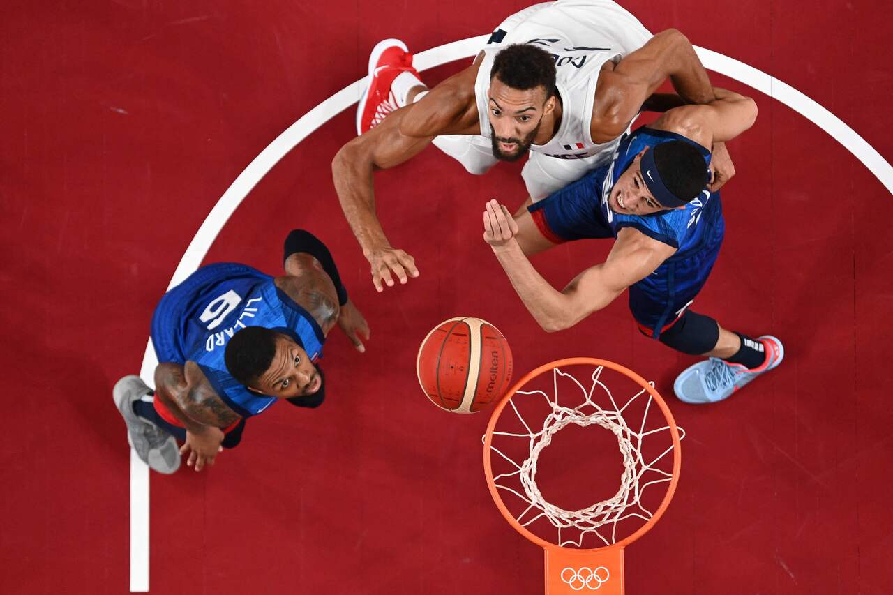 USA's Damian Lillard (left) looks on as teammate Devin Booker fights for a rebound with France's Rudy Gobert during the men's preliminary round group A basketball match on July 25, 2021.
