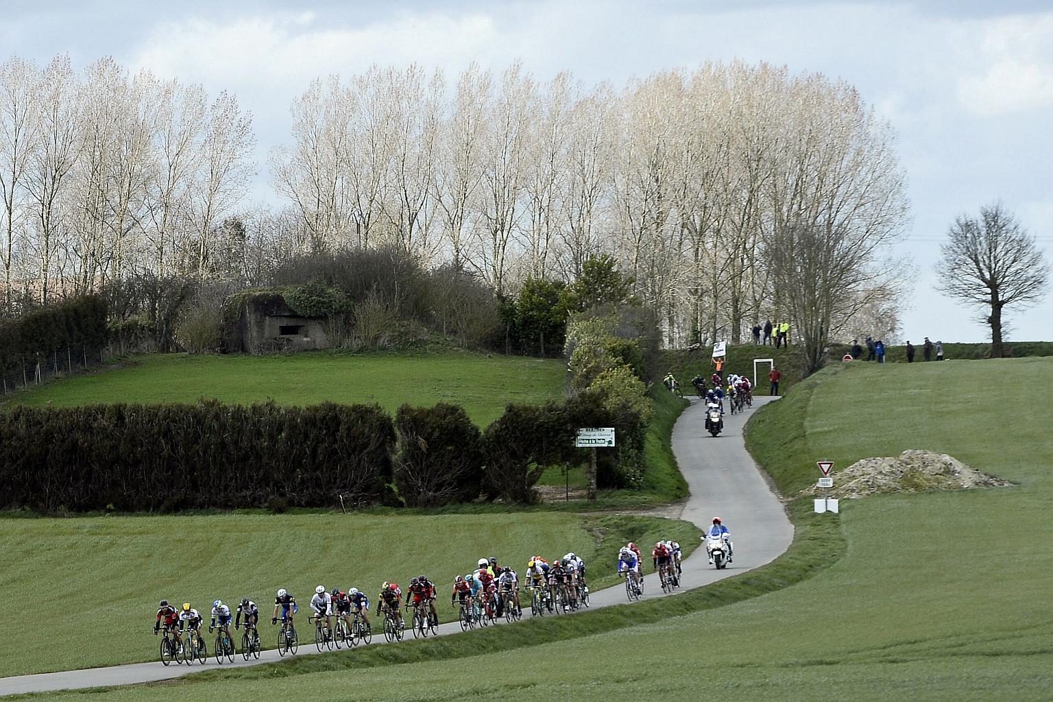 A pack of riders competing during the 78th edition of the Gent-Wevelgem race on March 27, 2016.