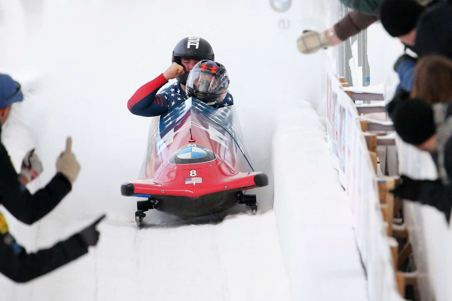 Steven Holcomb and Samuel McGuffie celebrate after winning first place int he 2-man bobsleigh competition on Dec 16, 2016.