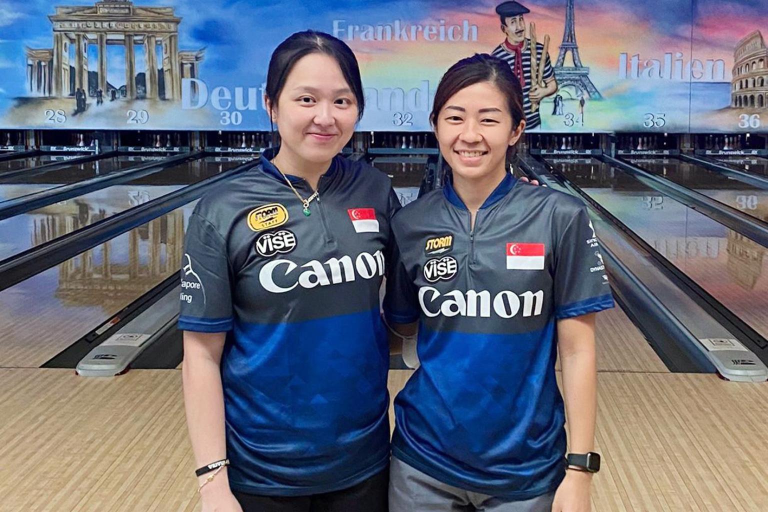 National bowlers Jazreel Tan (left) and Bernice Lim at Dream Bowl in Unterfohring, Germany.
