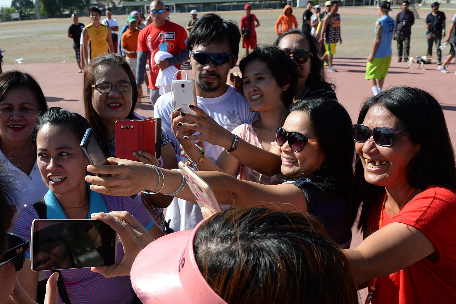 Philippine boxing icon Manny Pacquiao (in white) posing for photos with fans in Mindanao on Feb 19, 2016.