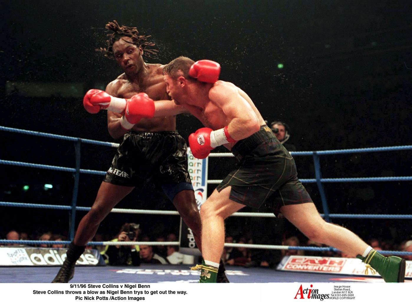 A 1996 photo shows Steve Collins throwing a punch as Nigel Benn trys to get out the way.