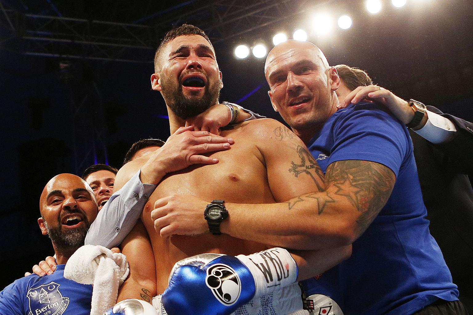 Tony Bellew celebrates winning the fight against Ilunga Makabu for the WBC Cruiserweight Title.