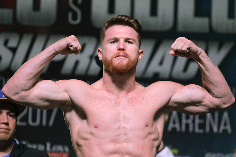 Saul "Canelo" Alvarez poses on the scales during a weigh-in with Gennady Golovkin (not pictured) at the MGM Grand Hotel & Casino in Las Vegas on Sept 15, 2017.