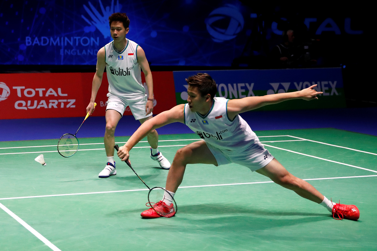 Indonesia's Marcus Fernaldi Gideon and Kevin Sanjaya Sukamuljo during a match in Birmingham, on March 15, 2020.