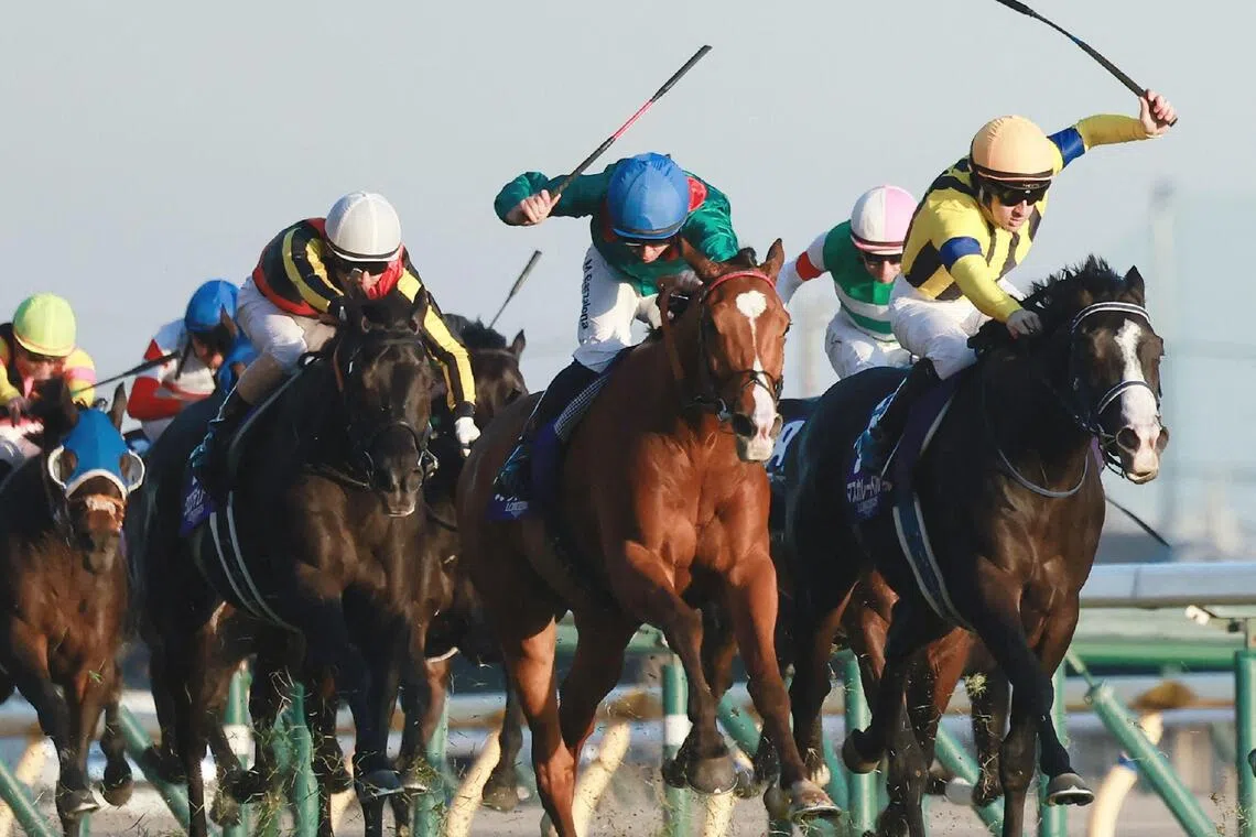 Calandagan (Mickael Barzalona, blue cap) holding off Masquerade Ball (Christophe Lemaire, yellow cap, second) and Croix Du Nord (Yuichi Kitamura, fourth) in the Japan Cup (2,400m) at Tokyo on Nov 30.