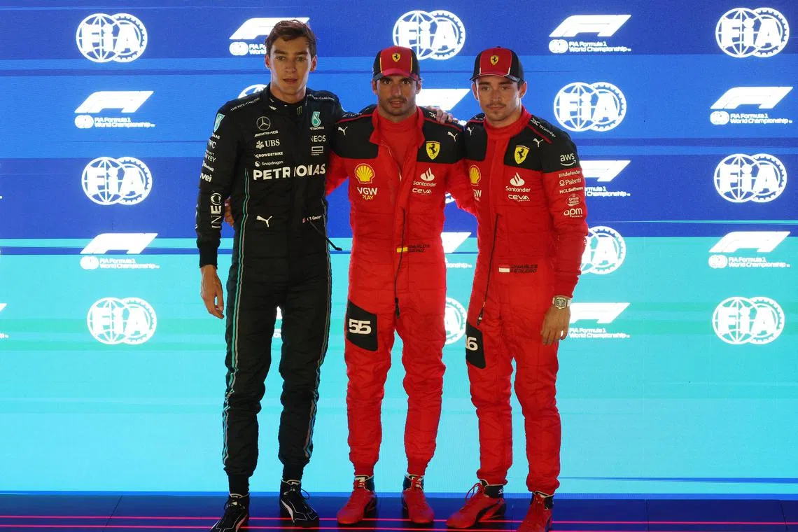 (From left) George Russell, Carlos Sainz and Charles Leclerc after the Singapore Grand Prix qualifying on Saturday.