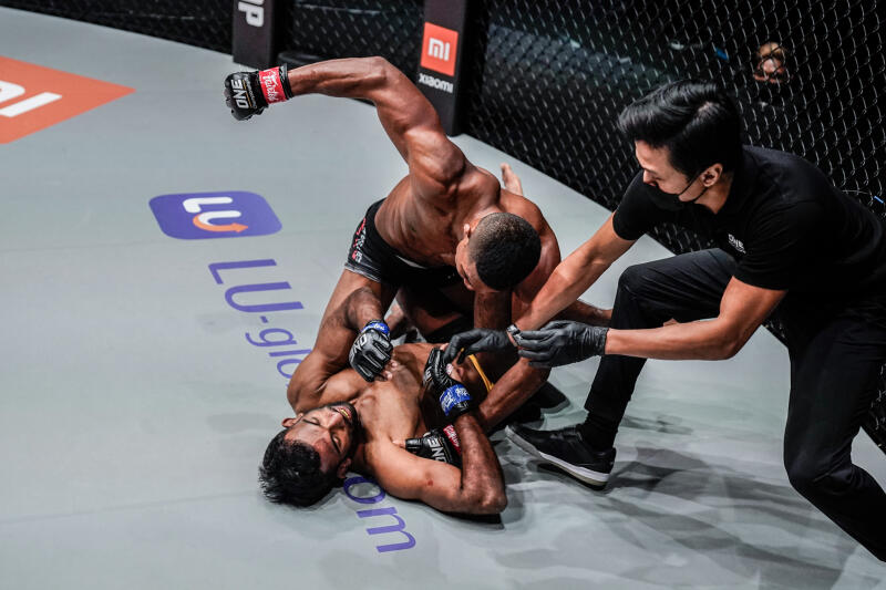 Singaporean MMA fighter Amir Khan (with red tape on gloves) in action against India's Rahul Raju during the earlier Reign of Dynasties event. Two cornermen from the US and Russia have tested positive for Covid-19.