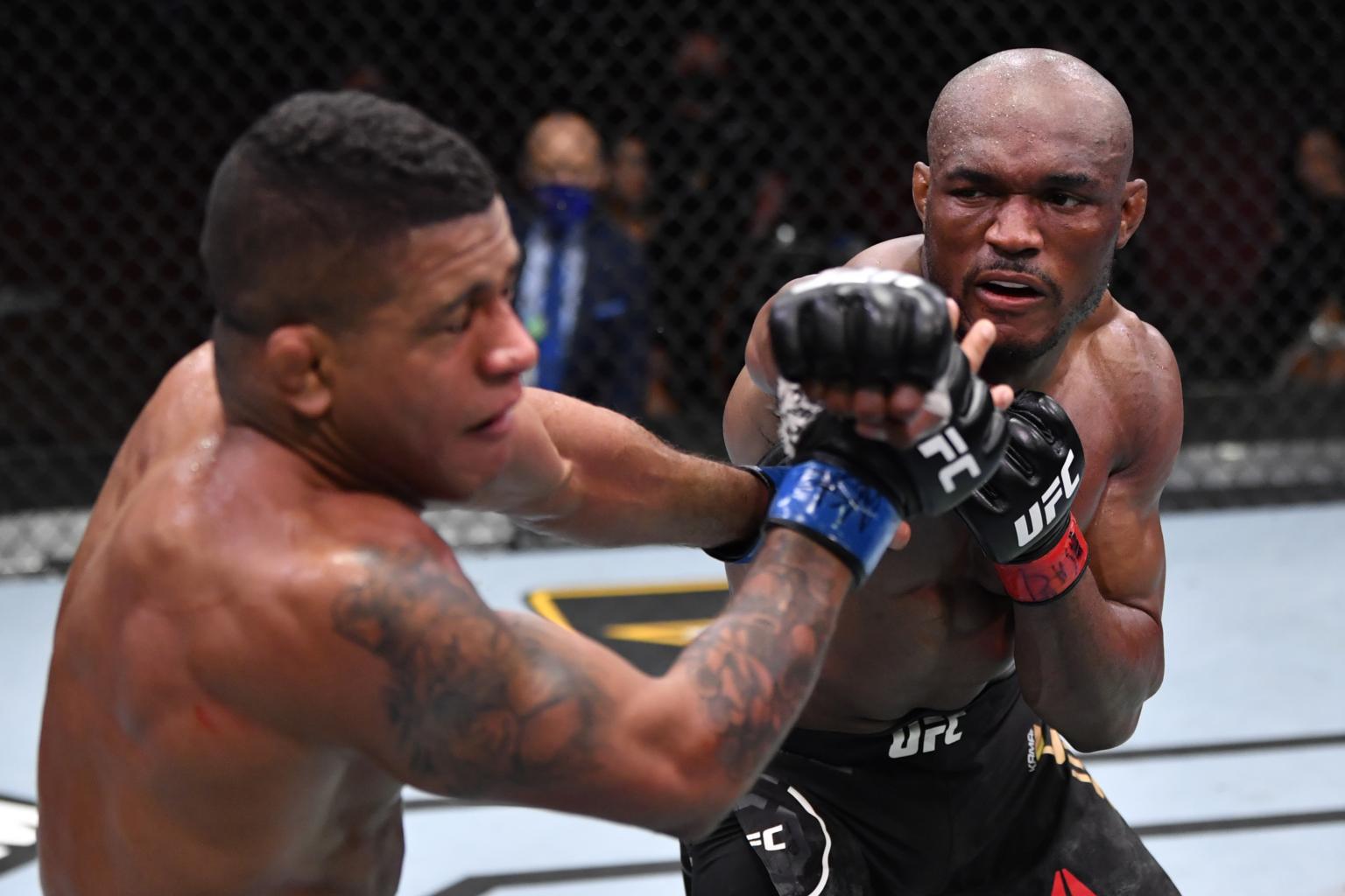 Kamaru Usman (right) landing a punch on Gilbert Burns during their UFC welterweight championship fight in Las Vegas on Feb 13, 2021.