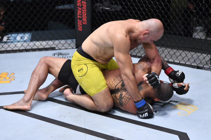 Glover Teixeira of Brazil punches Thiago Santos of Brazil during the UFC Fight Night event in Las Vegas, on Nov 7, 2020.