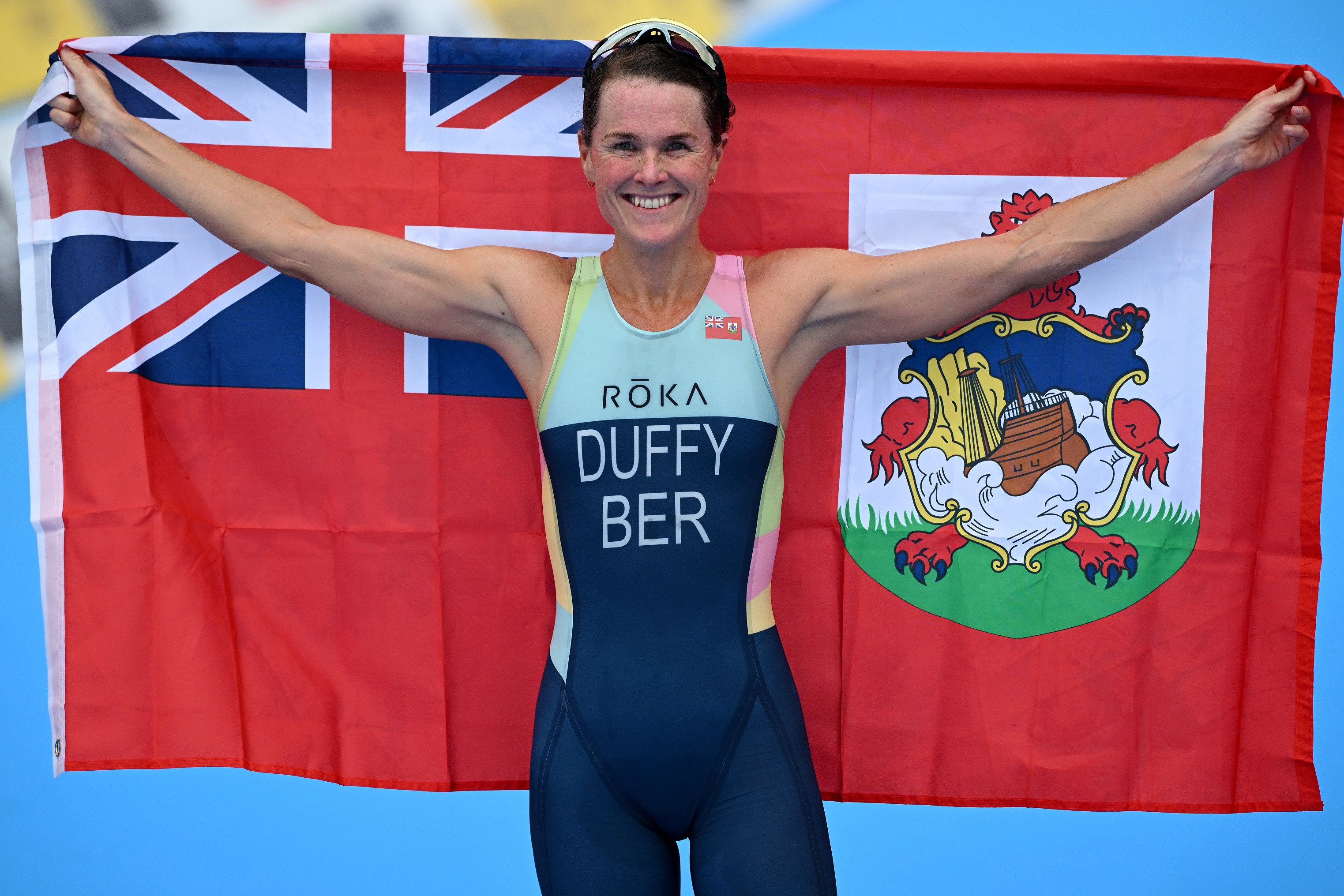 Flora Duffy of Bermuda wins gold in the women’s individual triathlon.