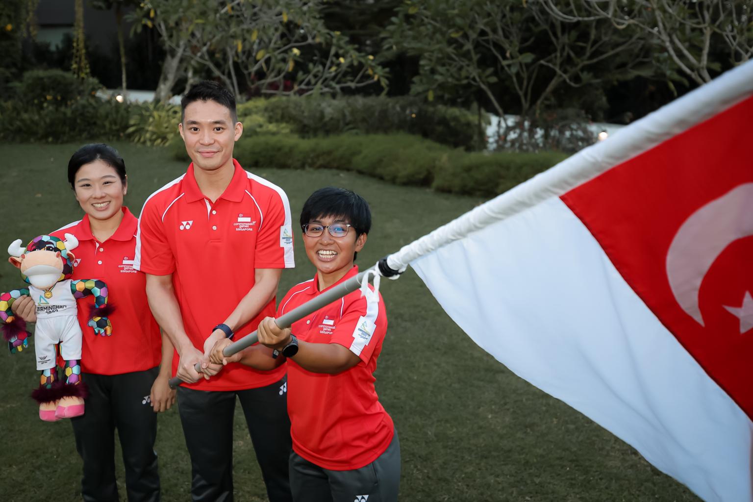 (From left) Chef de Mission for the Commonwealth Games Lim Heem Wei, badminton player Terry Hee and para-powerlifter Nur Aini Mohamad Yasli at the Team Singapore flag presentation ceremony, on July 7, 2022.