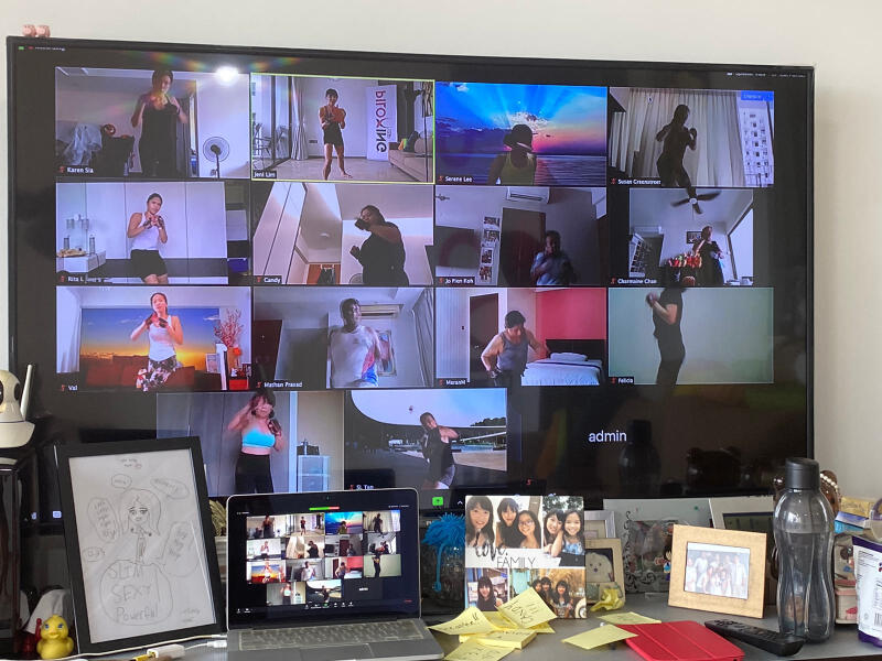 Piloxing coach Jeni Lim conducts an online class with her students during the circuit breaker period.