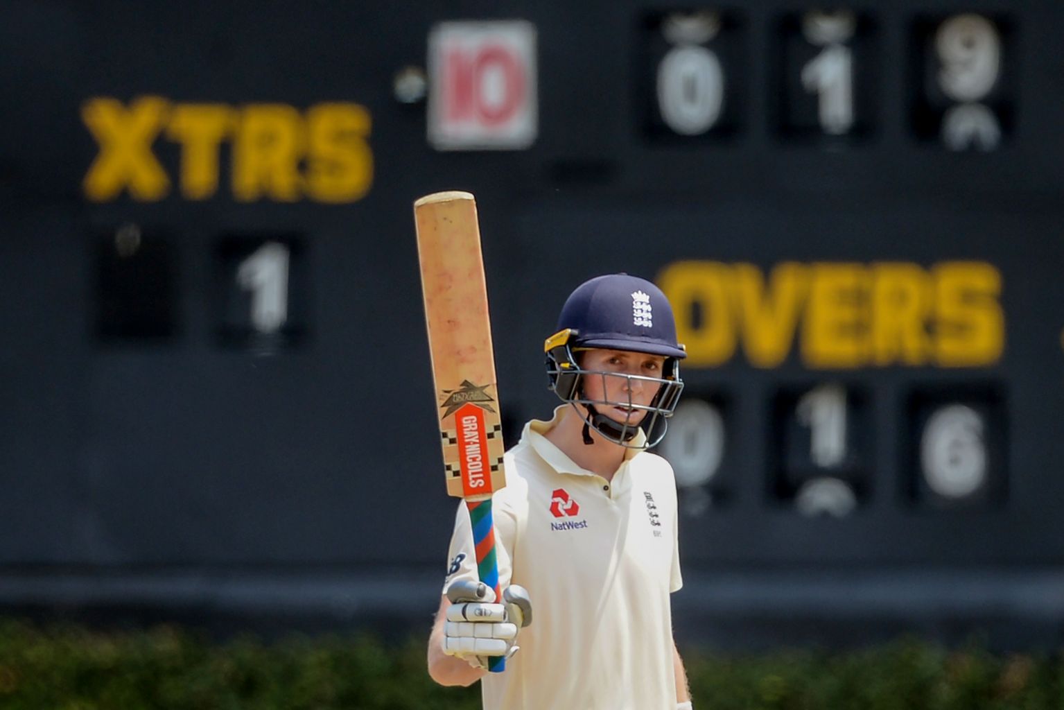 England's Zak Crawley raises his bat after scoring a half-century (50 runs) during a practice match against Sri Lanka on March 12, 2020.