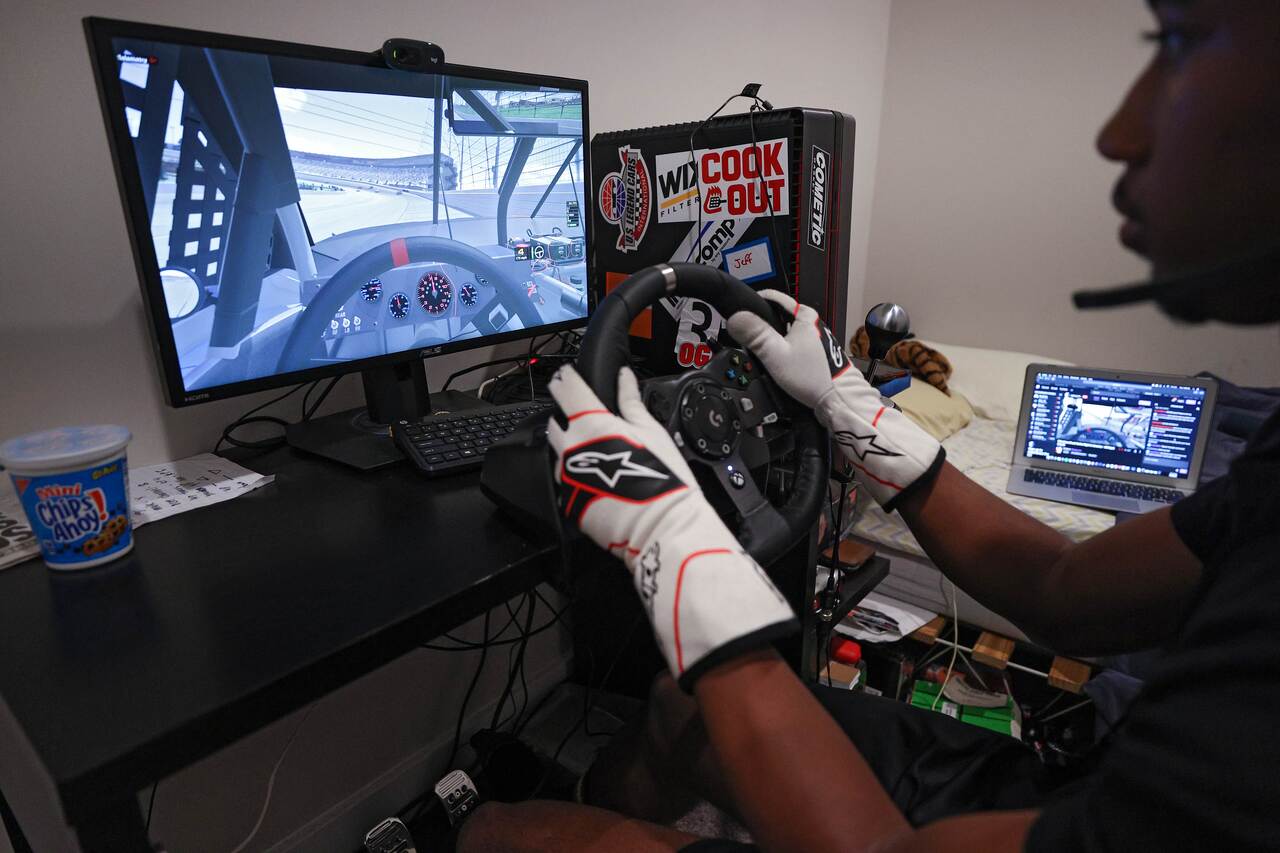 Rajah Caruth competes in the eTruck Series Night in America Powered by FilterTime, a live-online Nascar Truck Series race on the iRacing platform, from his bedroom of his parent's home in Washington, DC, on March 19, 2020.
