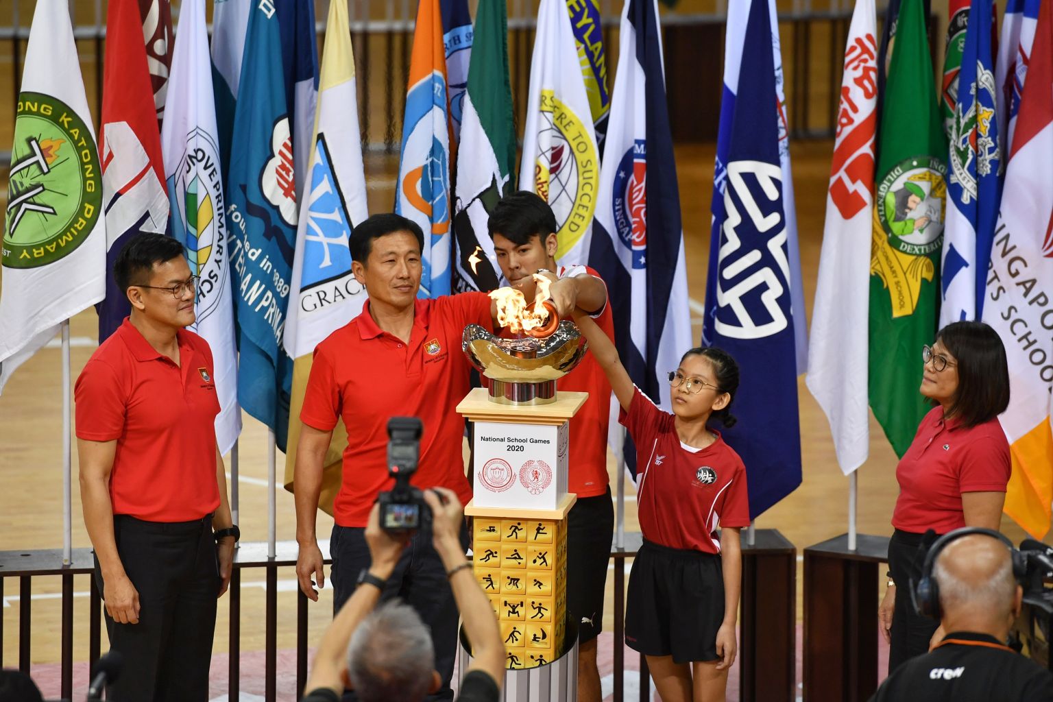 (From left) Tony Low, chairman of Singapore School Sports Council; Education Minister Ong Ye Kung; Zikos Chua (football) from Nanyang JC; Adelina Cheok (rope skipping) from Edgefield Primary; Singapore Primary School Sports Council chairman Lee Hui Feng light the cauldron during the National School Games opening ceremony at the OCBC Arena on Jan 21, 2020.