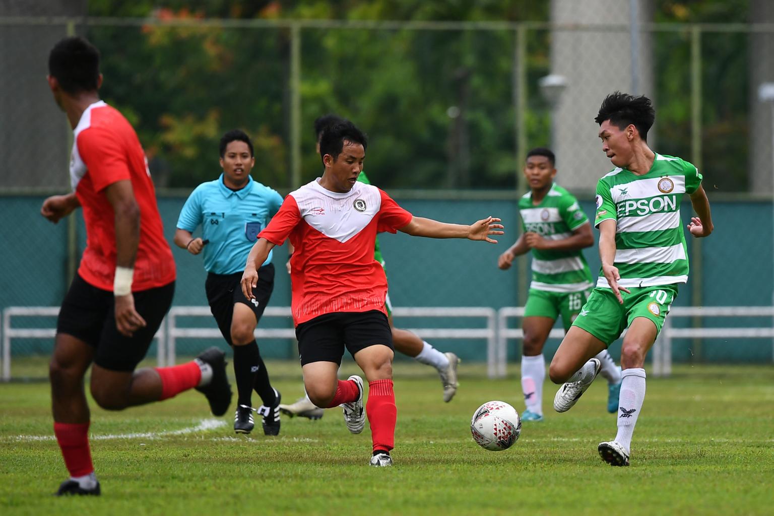 A football match between Singapore Premier League teams Geylang International (in green) and Tanjong Pagar United (in red) at Jurong West Stadium on Feb 8, 2020.