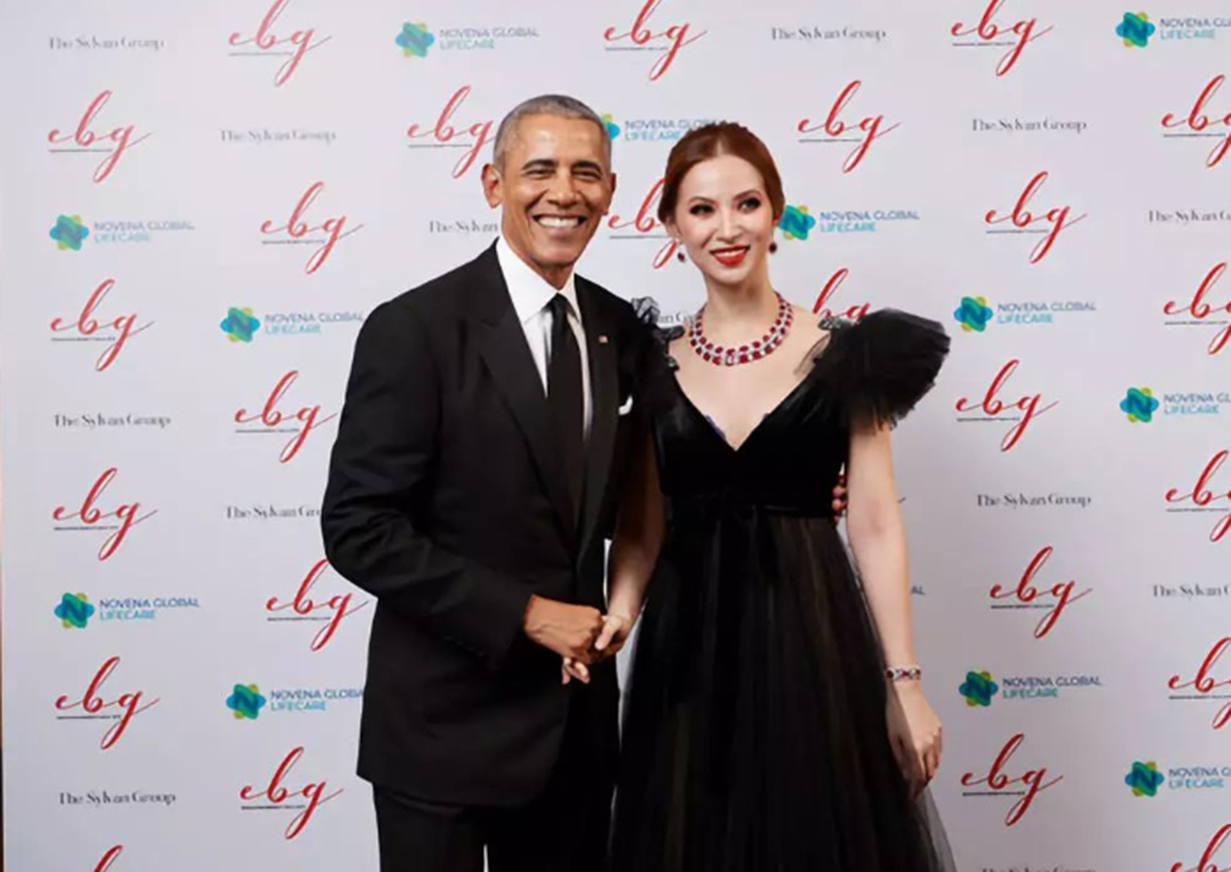 A publicity picture distributed by Bellagraph Nova Group Evangeline Shen meeting former US President Barack Obama.