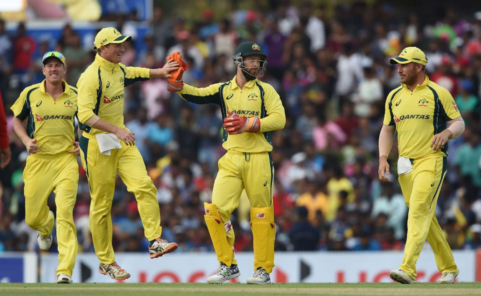Australian wicketkeeper Mathew Wade (second right) celebrates with teammates after dismissing Angelo Perera.
