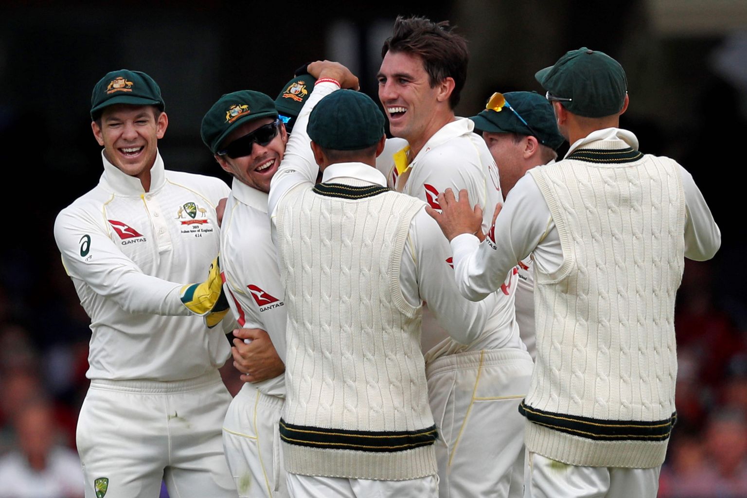 Australia's Pat Cummins (centre) celebrates with team mates after they took the wicket of England's Rory Burns for 53 runs.