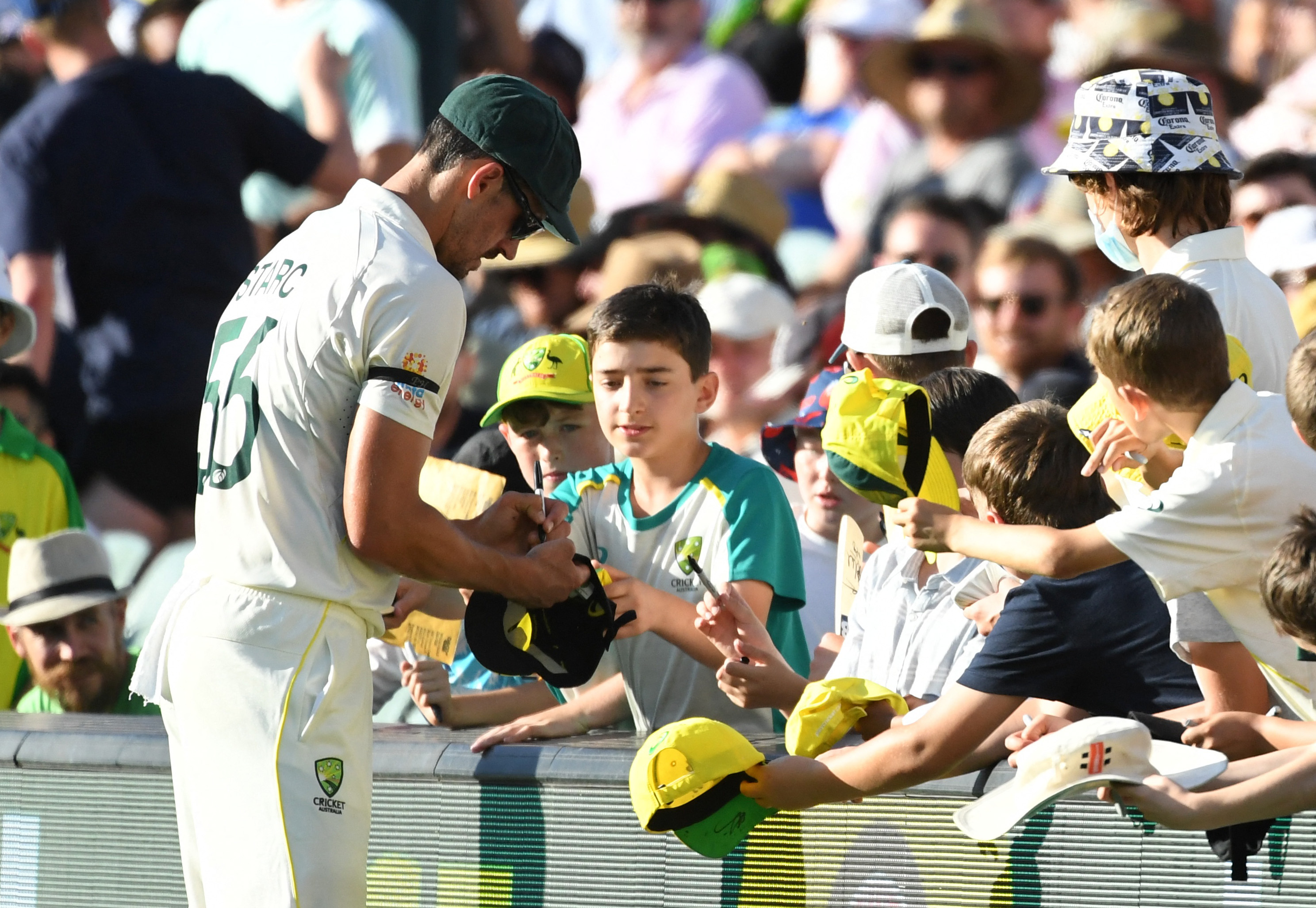 Australia's Mitchell Starc signs autographs for fans at the Adelaide Oval on Dec 18, 2021.