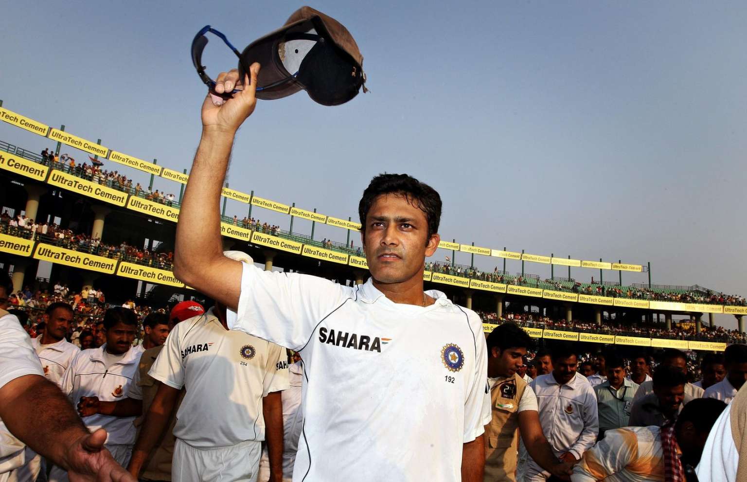 Anil Kumble salutes the crowd with his cap during the last day of the third test match between India and Australia in New Delhi, on Nov 2, 2008.