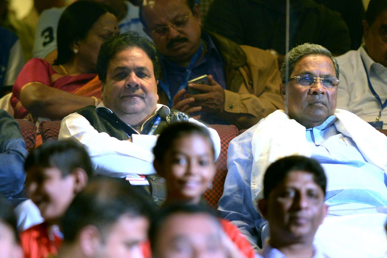 Chairman of the Indian Premier League Rajeev Shukla (left) and Chief Minister of Karnataka, Siddaramaiah, watch the final Twenty20 cricket match of the 2016 Indian Premier League, on May 29, 2016.