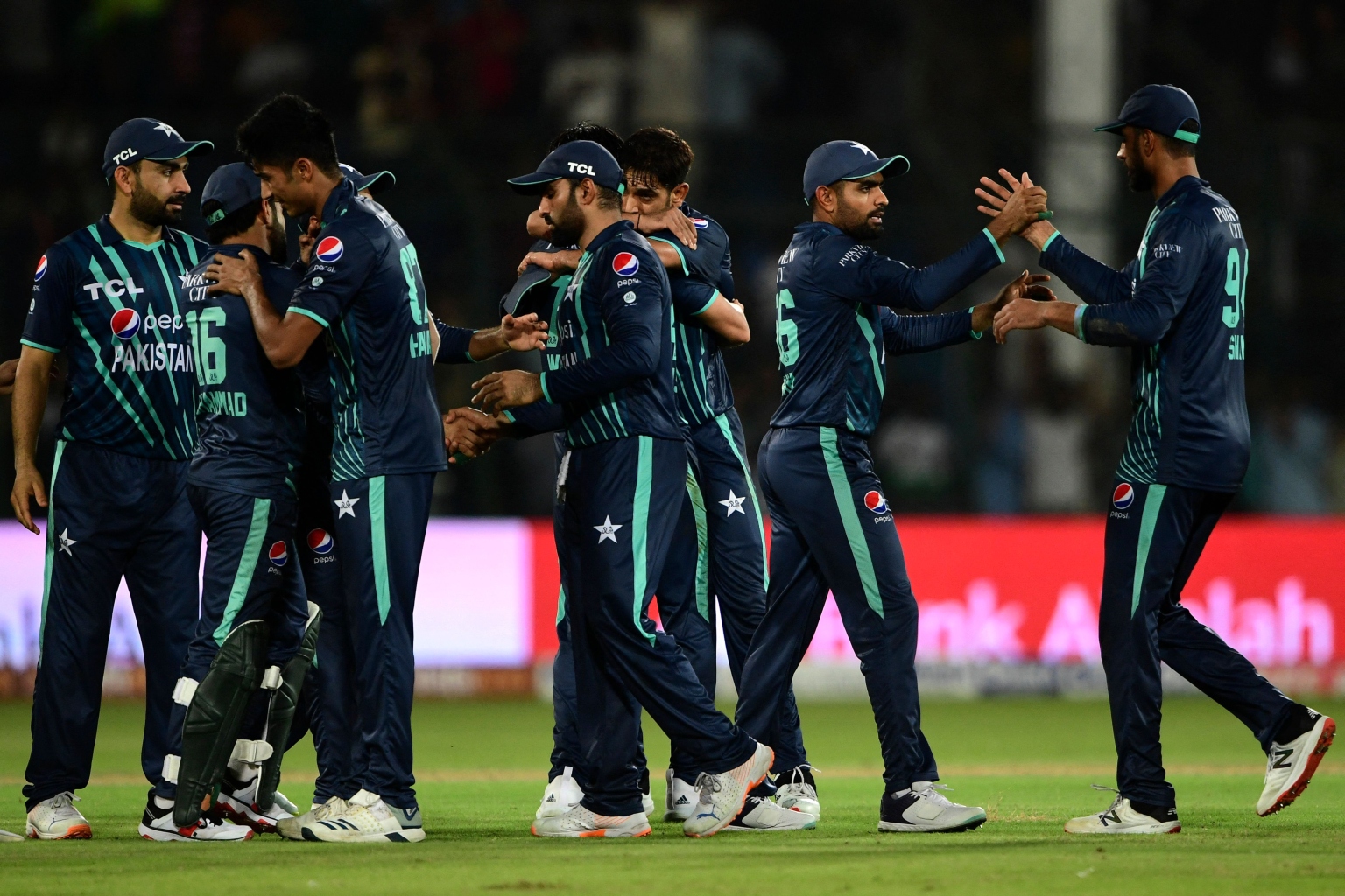 Pakistan's players celebrate their victory at the end of the cricket match in Karachi on Sept 25, 2022.