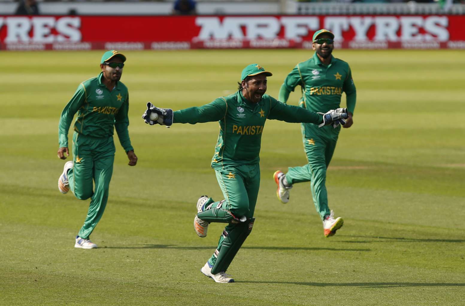 Pakistan's Sarfraz Ahmed and team mates celebrate winning the ICC Champions Trophy.