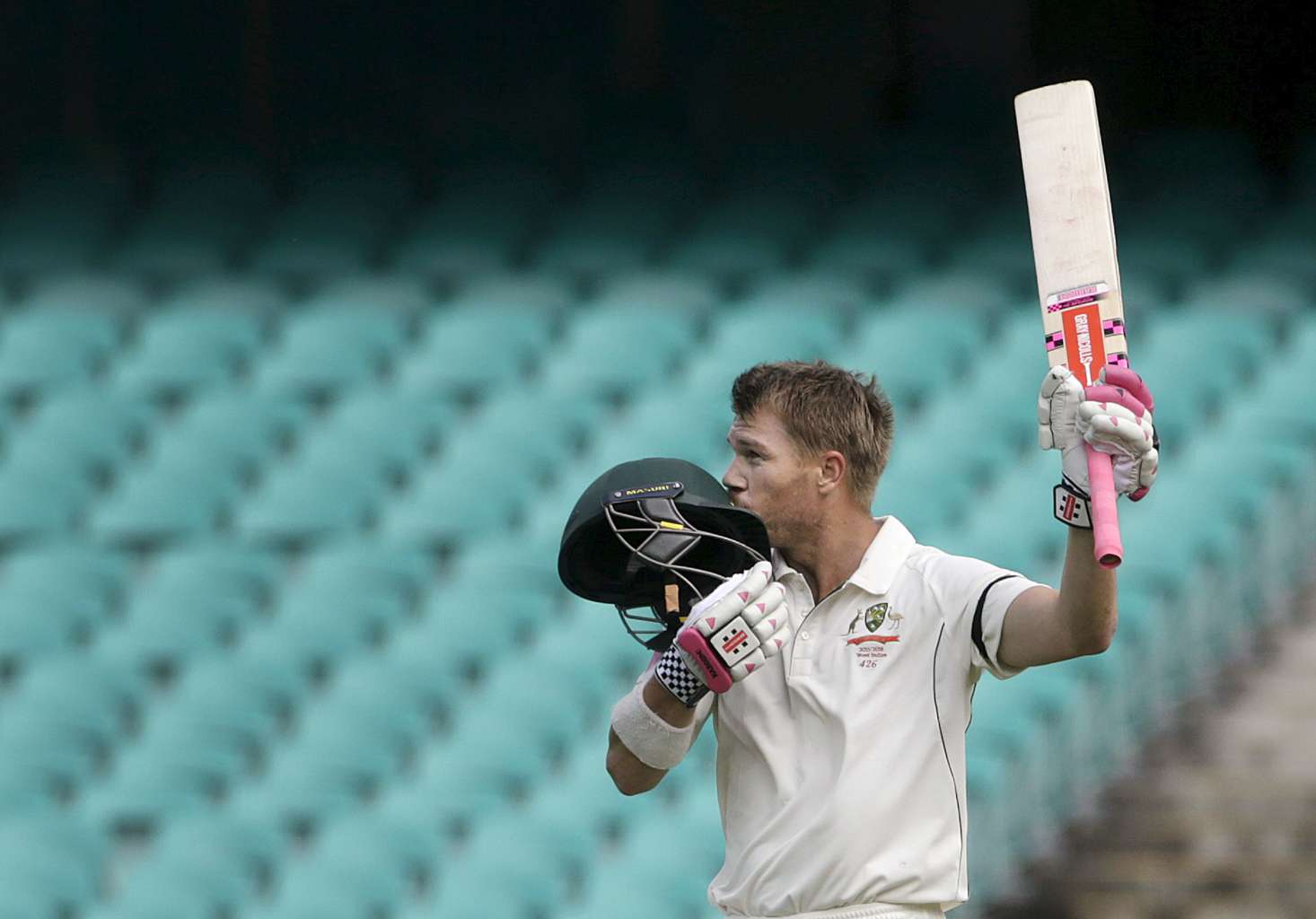 David Warner kisses his helmet in celebration after scoring a century against the West Indies.