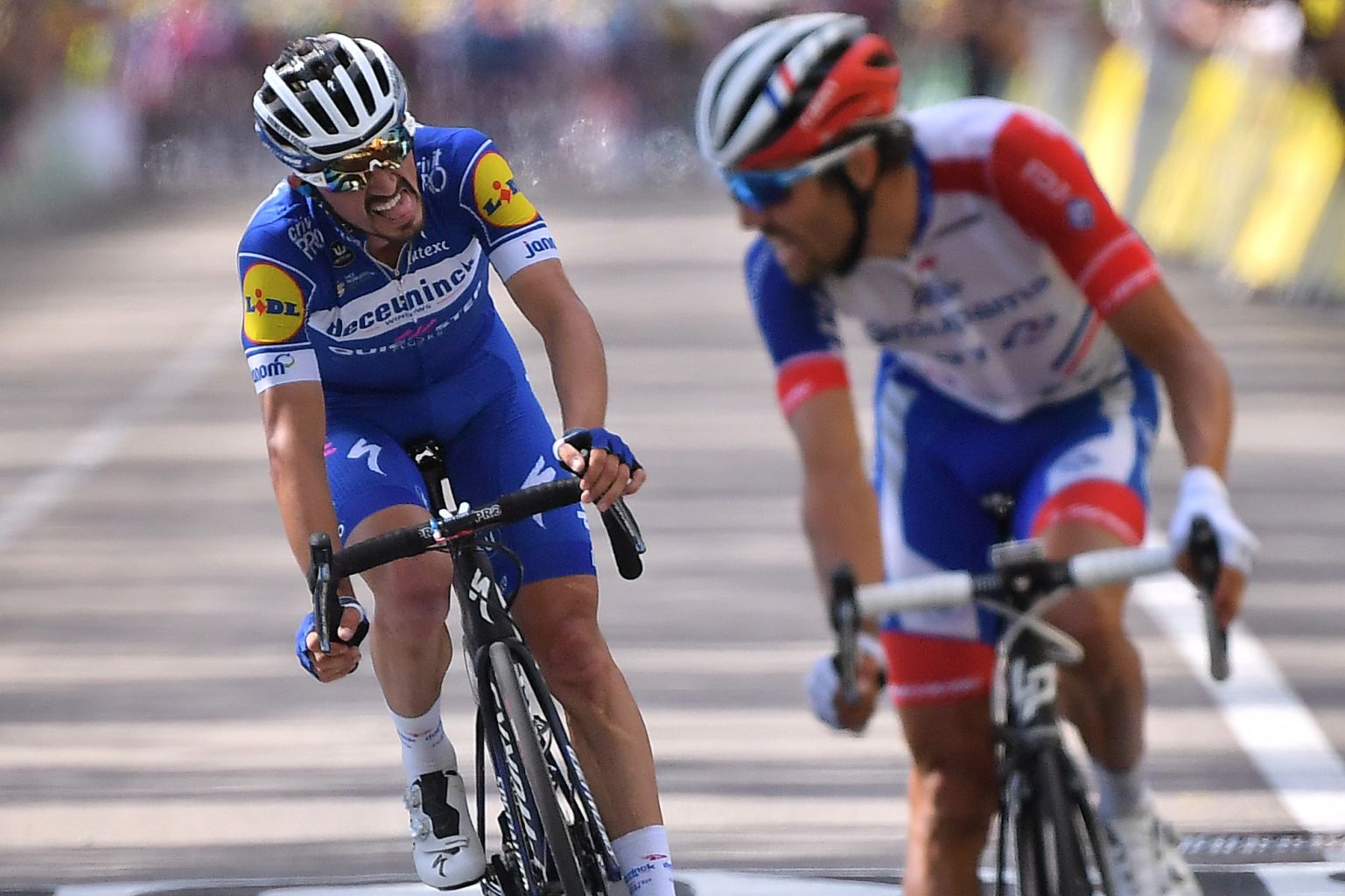 Julian Alaphilippe (left) and Thibaut Pinot react on the finish line.