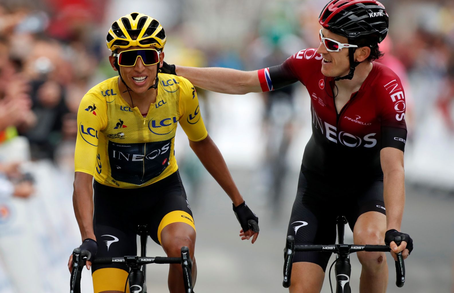 Team Ineos rider Egan Bernal of Colombia celebrates as he finishes with team mate Geraint Thomas of Britain.