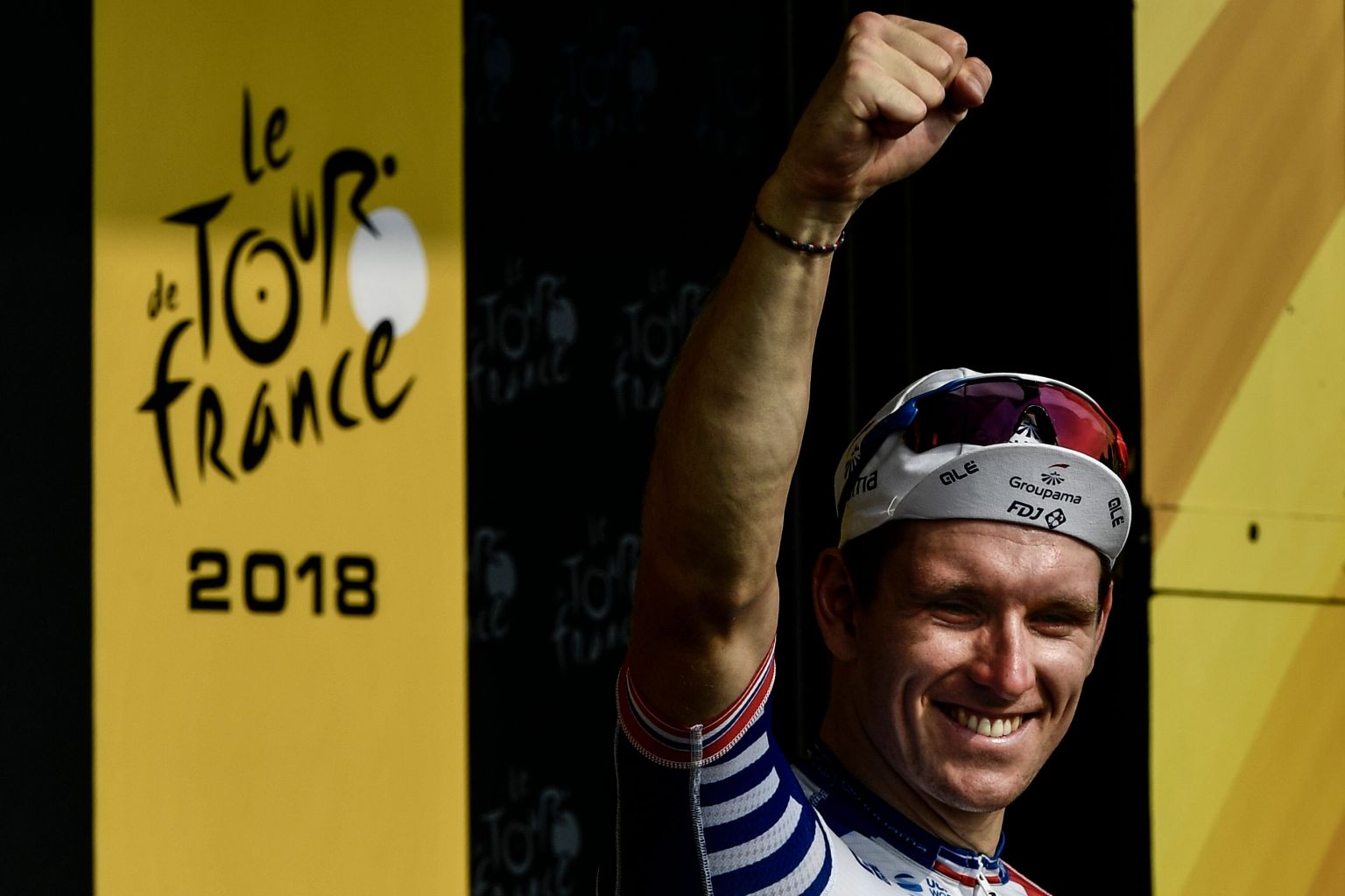 France's Arnaud Demare celebrates on the podium after winning the 18th stage.
