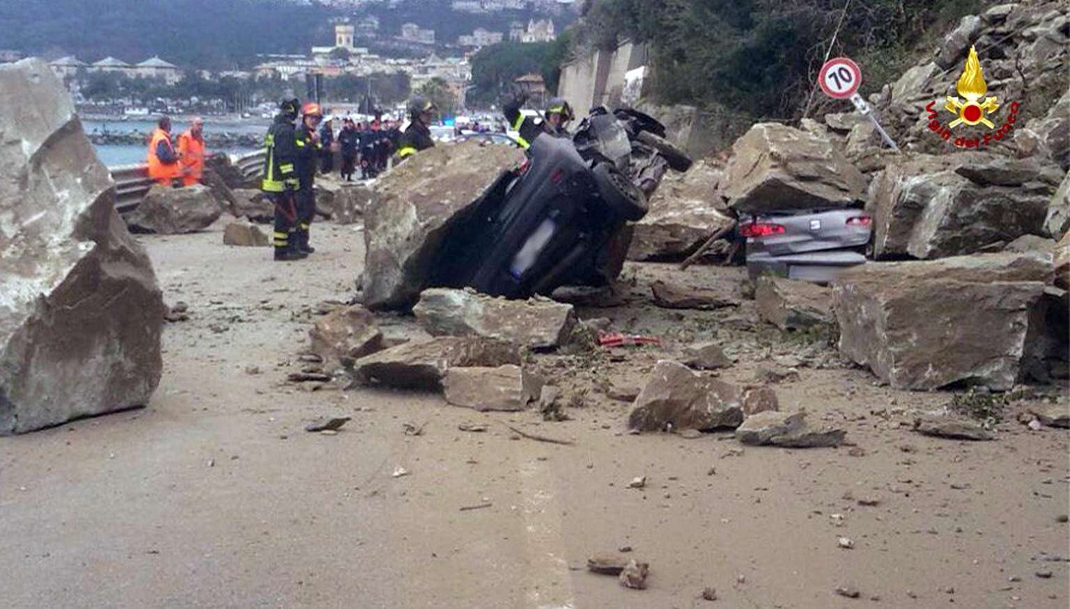 The scene of the rockslide in Arenzano that provoked a route change during the Milan-San Remo cycling race.