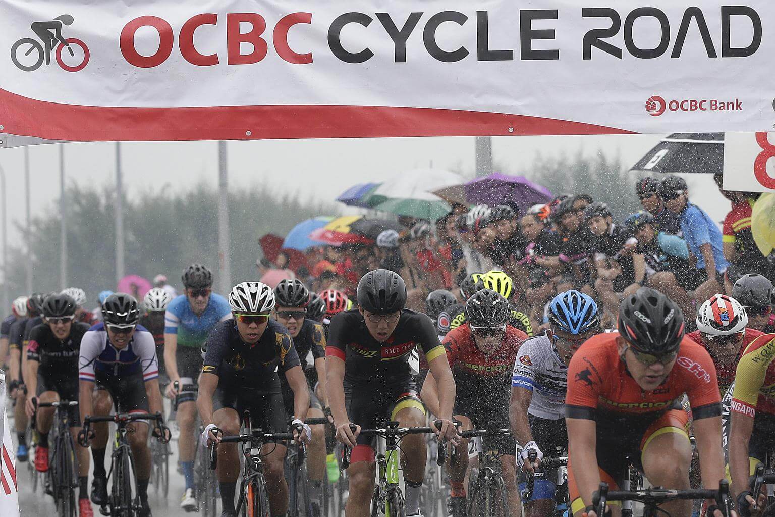 Participants racing in the rain during the Men's Open category of OCBC Cycle National Road Championship at Seletar North Link on May 21, 2017.