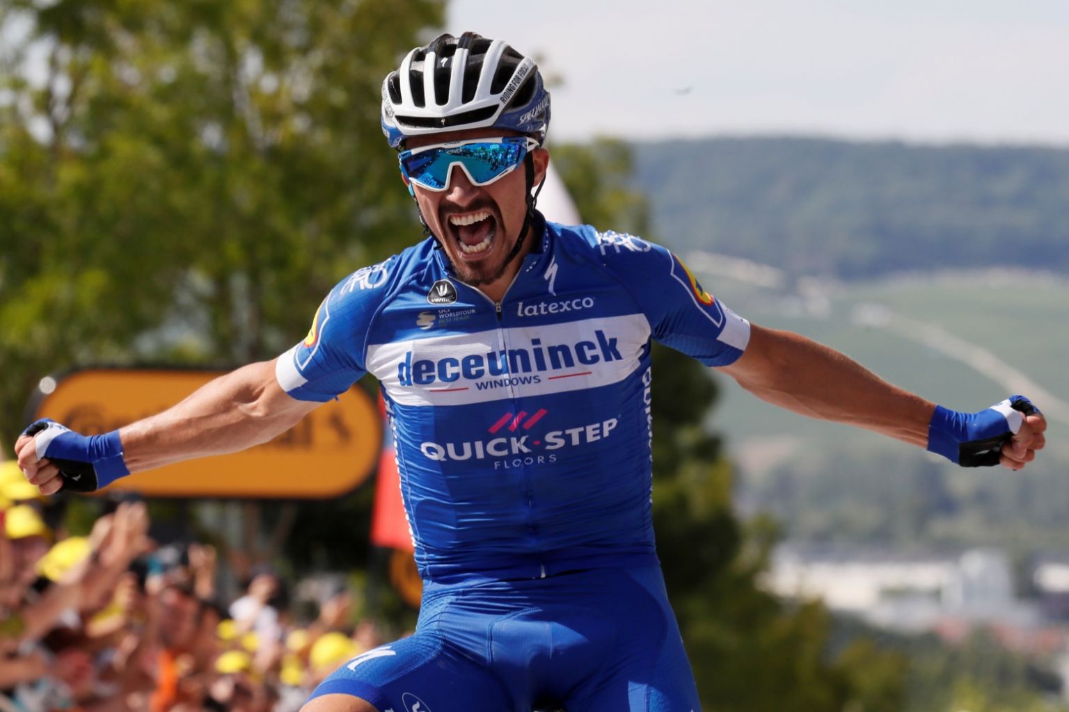 The crowd in the French Champagne region had been the peloton and went wild as Alaphilippe came up alone and rose in his saddle to swagger over the last steep climb.