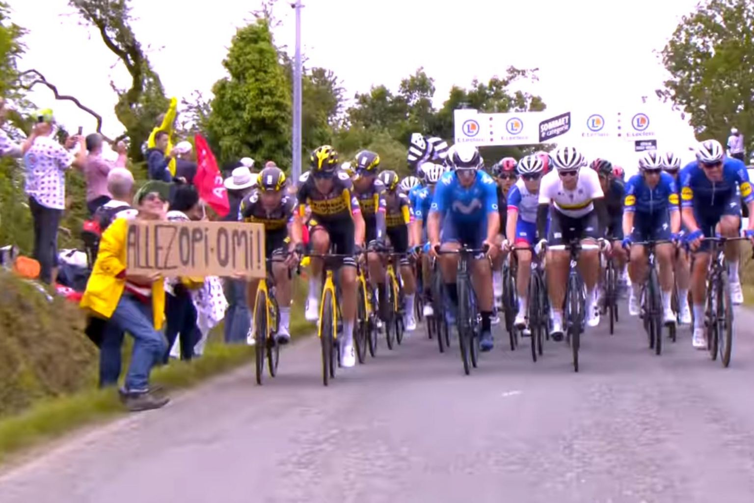 The woman had held up a sign with 'Granny and Grandad' written in German, looking up the road towards the race's motorbike cameras with her back to the speeding peloton.