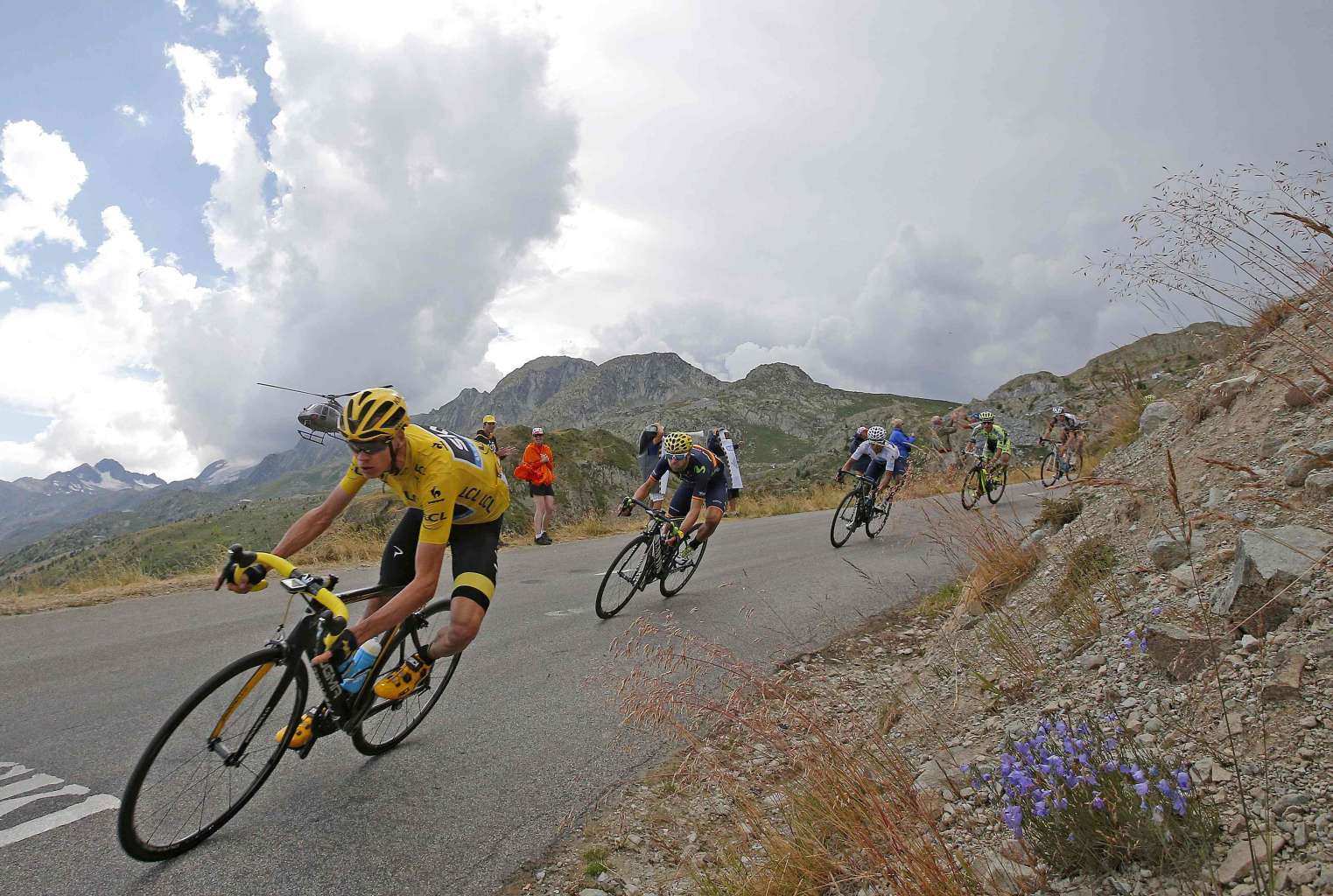Froome, in the overall race leader's yellow jersey, speeds downhill in the Glandon pass during the 19th stage of the Tour de France.