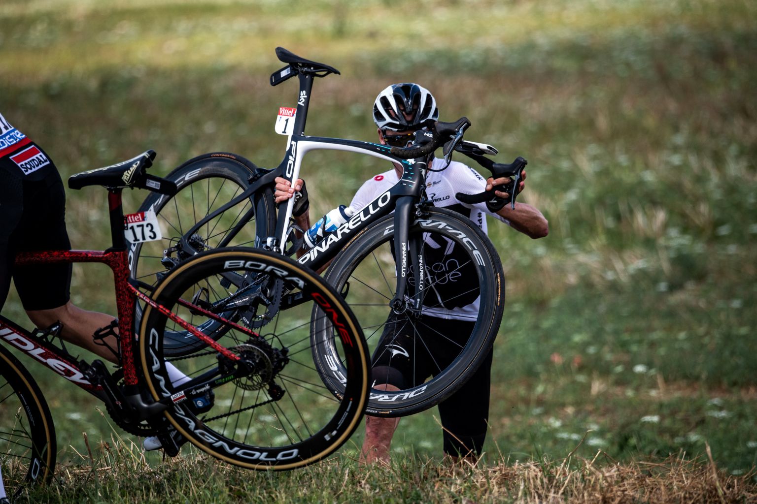 Froome carries his bicycle after his crash.