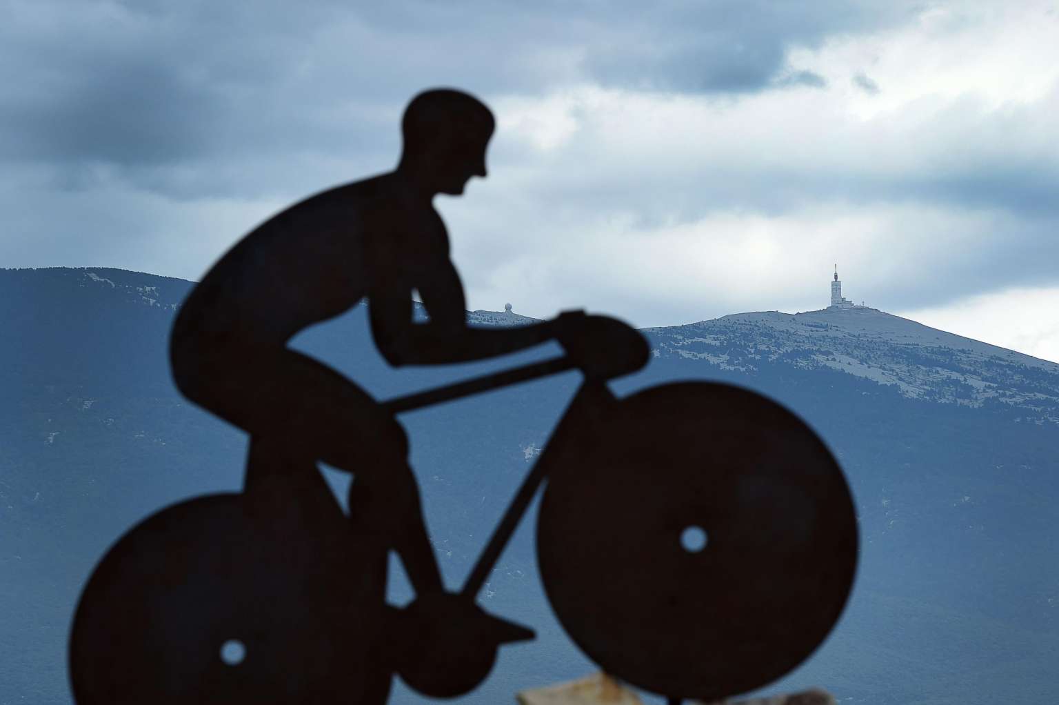 A picture taken on the Mont Ventoux on July 12, two days before the passage of the Tour de France shows a sculpture of a cyclist against the Mont Ventoux' summit.