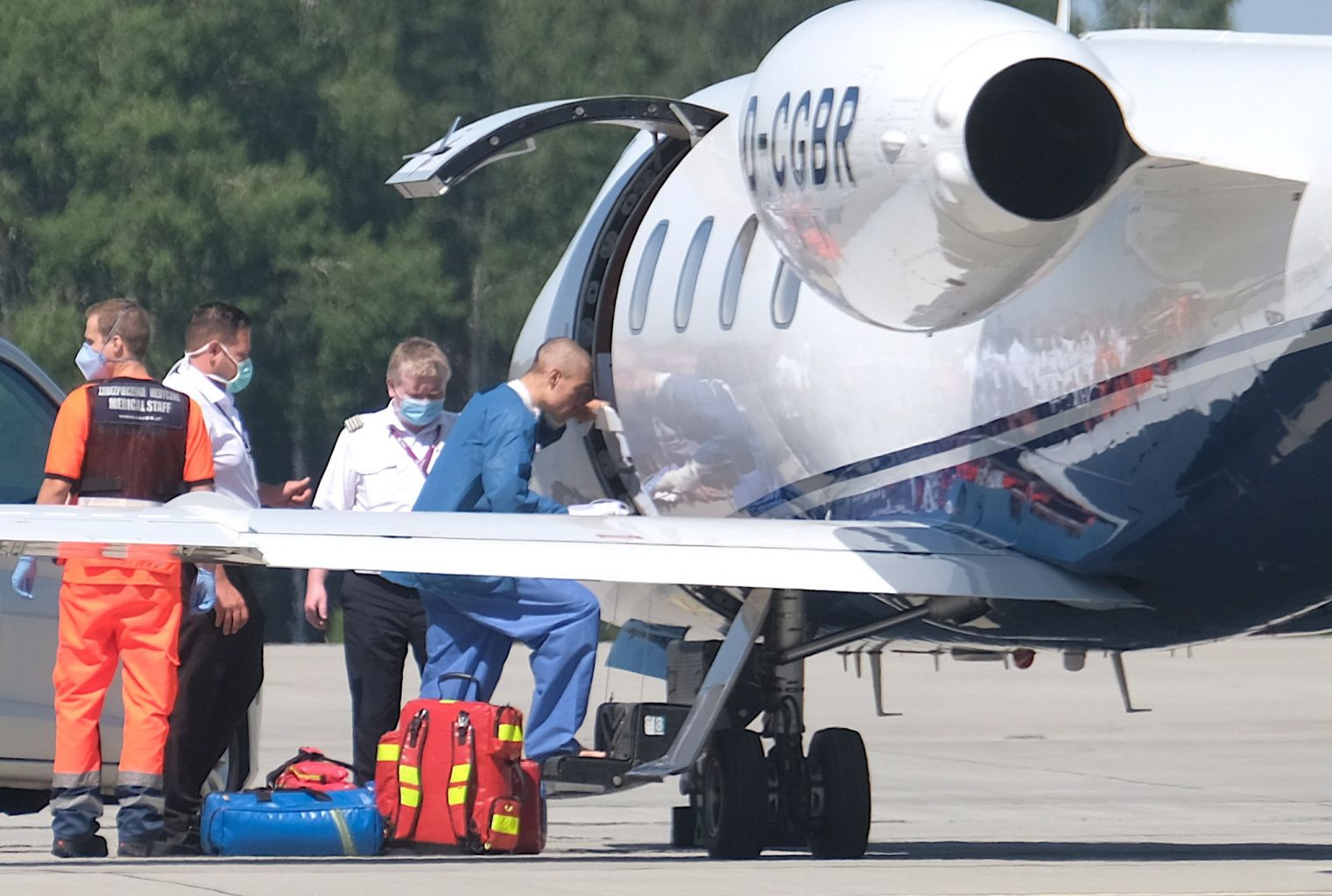 Jakobsen (right) boards a plane to return home at the airport in Pyrzowice, southern Poland, Aug 12, 2020.